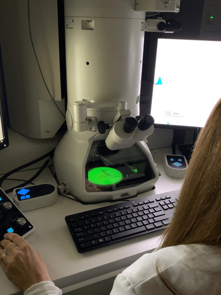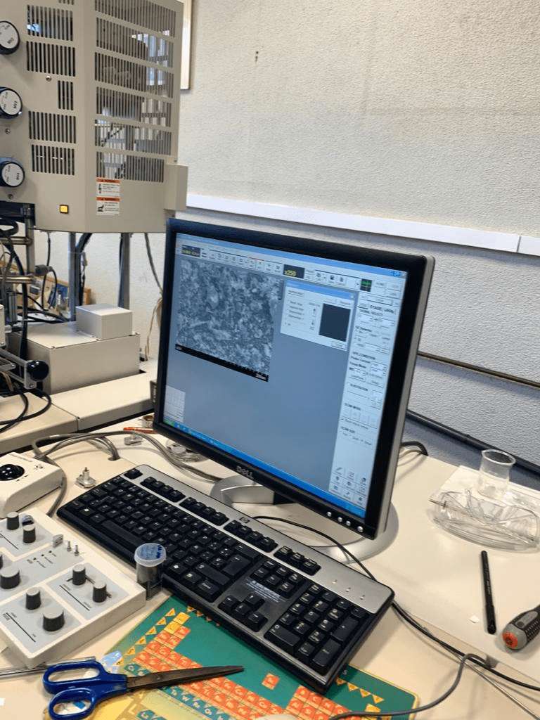 Este es el equipo del microscopio electrónico. El microscopio electrónico usa como fuente de iluminación un haz de electrones en lugar de un rayo de luz visible. Este presenta menos aumento que el microscopio óptico de barrido. En este podemos ver la morfología del material que queremos observar. En una muestra de carbón podemos ver la morfología o la composición química (O,Cl,Ca). Algunos grupos trabajan en capas de tejidos y les preguntan por su morfología (se complementan con otros laboratorios).
